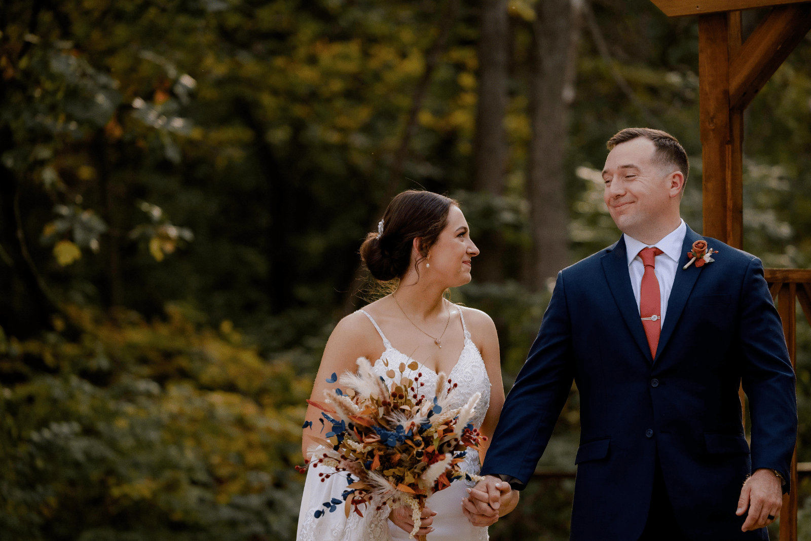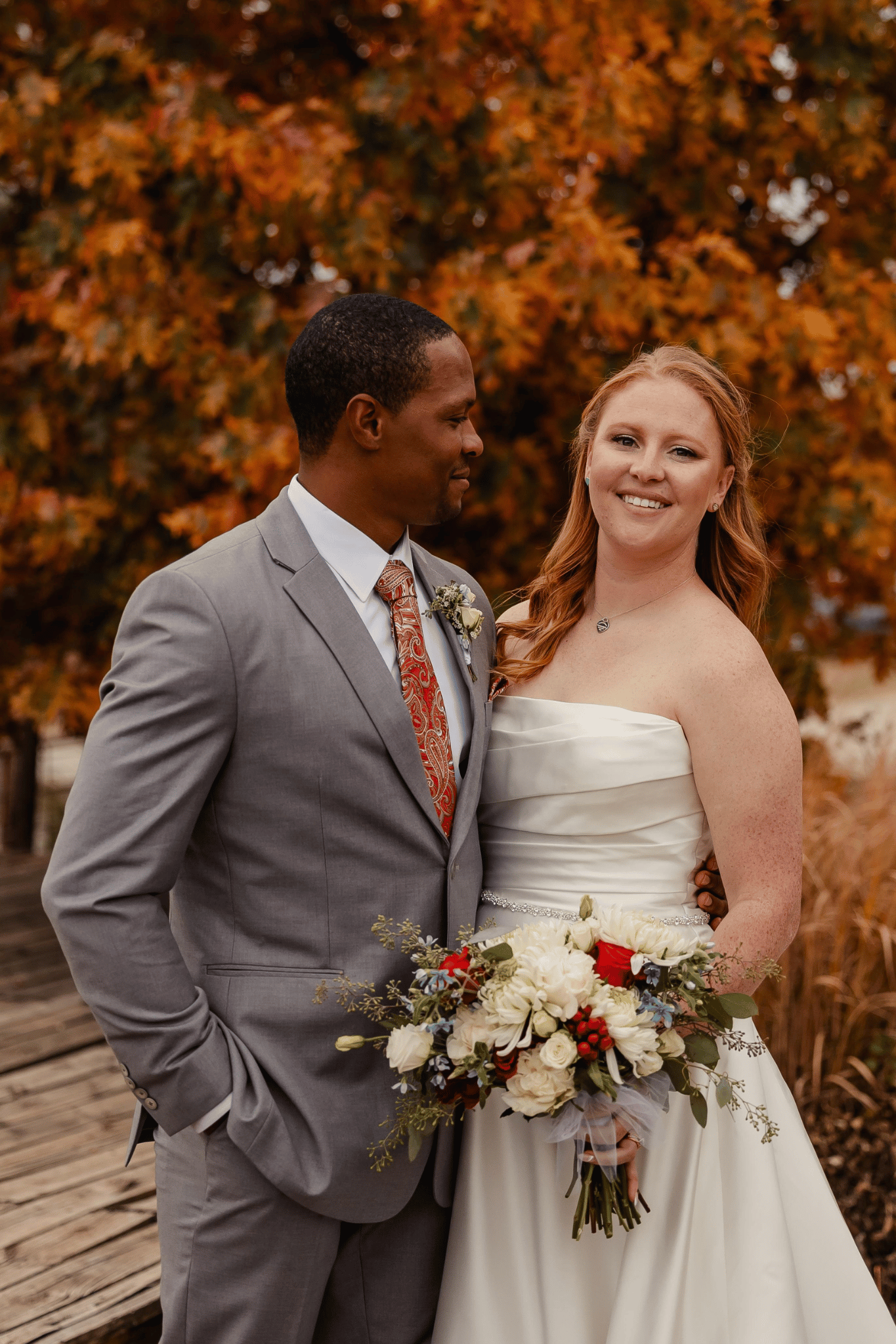 Tori and Jacob’s tied the knot in October, surrounded by the natural beauty of changing fall colors. They embraced classic attire with Tori’s in a timeless white gown and Jacob’s in a sharp navy suit. Their florals brought seasonal depth, mixing champagne tones with pops of orange and cream burgundy. The outdoor portraits were stunning, with golden leaves providing a natural autumn backdrop that made every moment feel warm and romantic. Inside, their venue carried the same seasonal charm, featuring wood floors and gold chairs that blended seamlessly with the overall vibe.