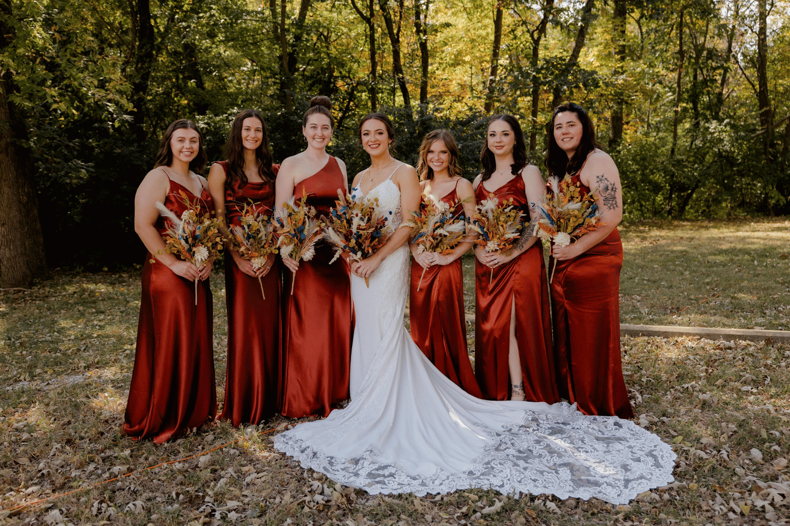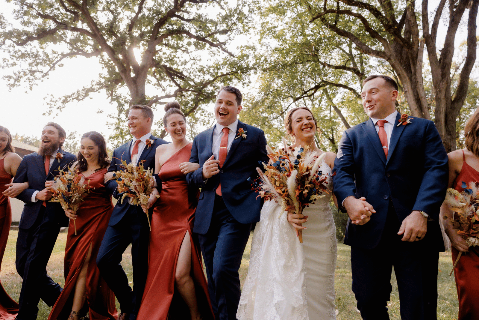 Color is where Kansas fall weddings shine most. Here are some combinations couples often love for the season: