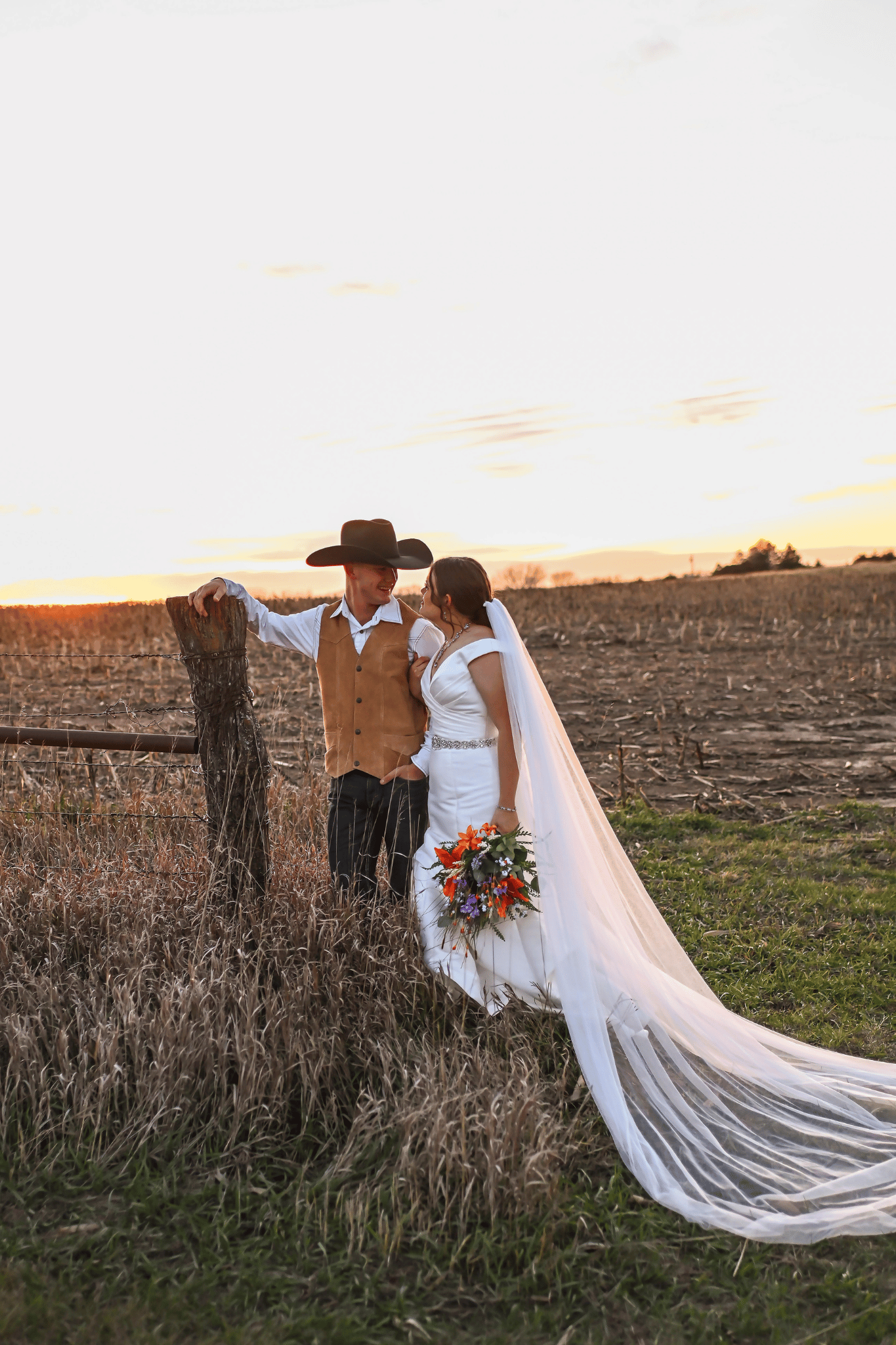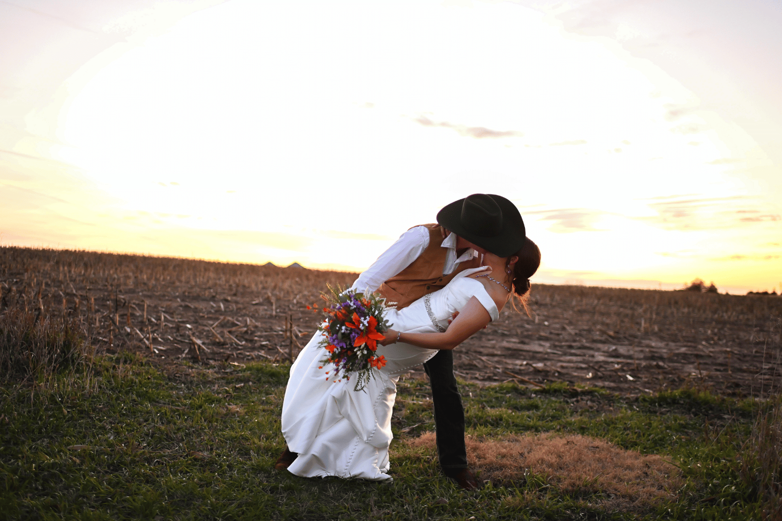 Katherine and Milan leaned into a full autumn palette mixed with rustic charm for their November wedding, creating a warm seasonal atmosphere. Katherine’s bouquet combined real blooms with dried florals, blending reds, oranges, and greens in rich fall tones. Her beautiful gown carried the same cozy feeling, perfectly complementing the season’s charm. Cordell wore a brown suit with a cowboy hat, bringing a refined yet relaxed style. Their bridal party added more depth, with bridesmaids in varied shades of purple and olive. Groomsmen balanced the look wearing white shirts and jeans along with boutonnieres that matched the bride’s bouquet.